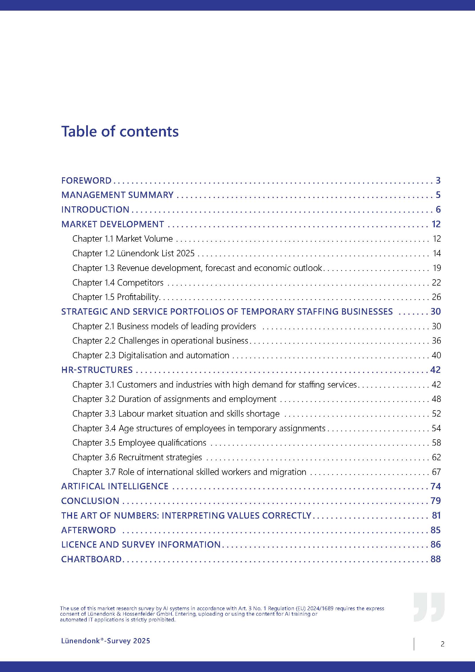 All results of the comprehensive survey of 87 temporary employment agencies, included as a graphical evaluation and commented and categorized on the basis of many years of market observation