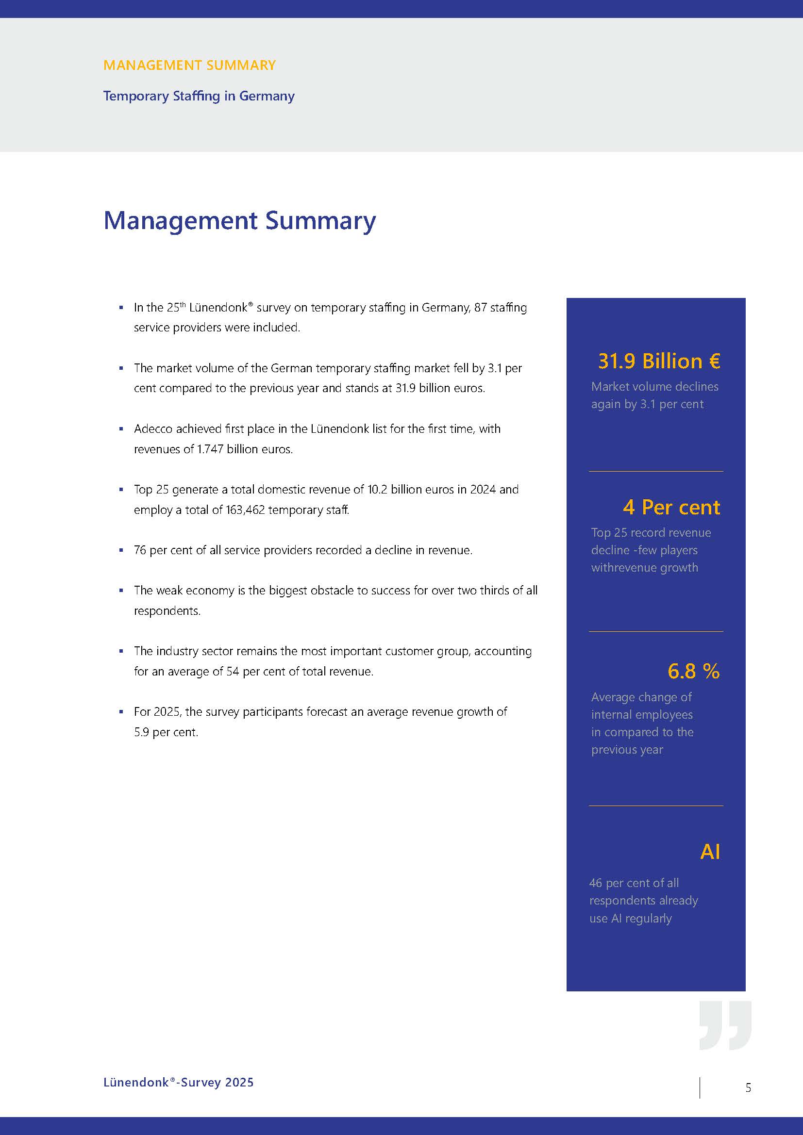 “For Randstad, the annual Lünendonk Survey is essential reading: it makes a valuable contribution to benchmarking and allows us to assess how our company is positioned in the market and in terms of a variety of trends and developments for the future.”
