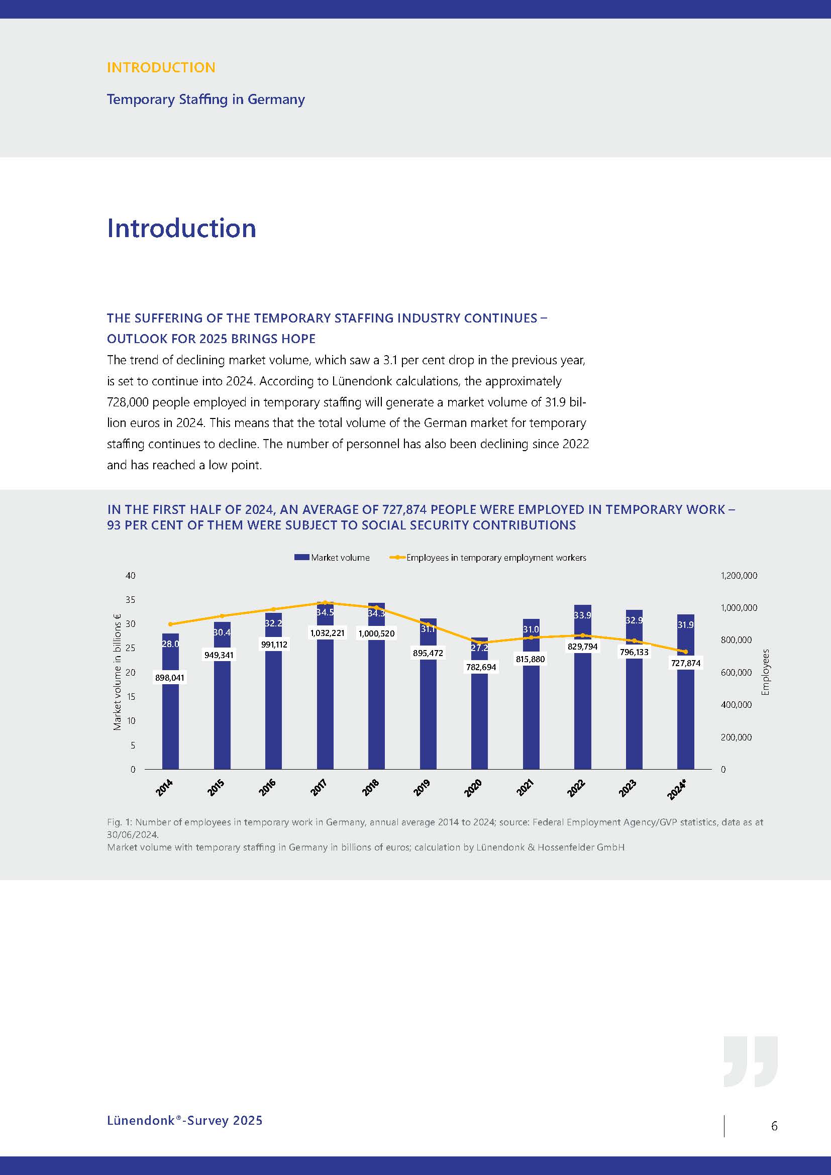 Key figures on the temporary staffing market, such as revenue and internal employees as well as those working on customer assignments, but also developments, current topics, and trends