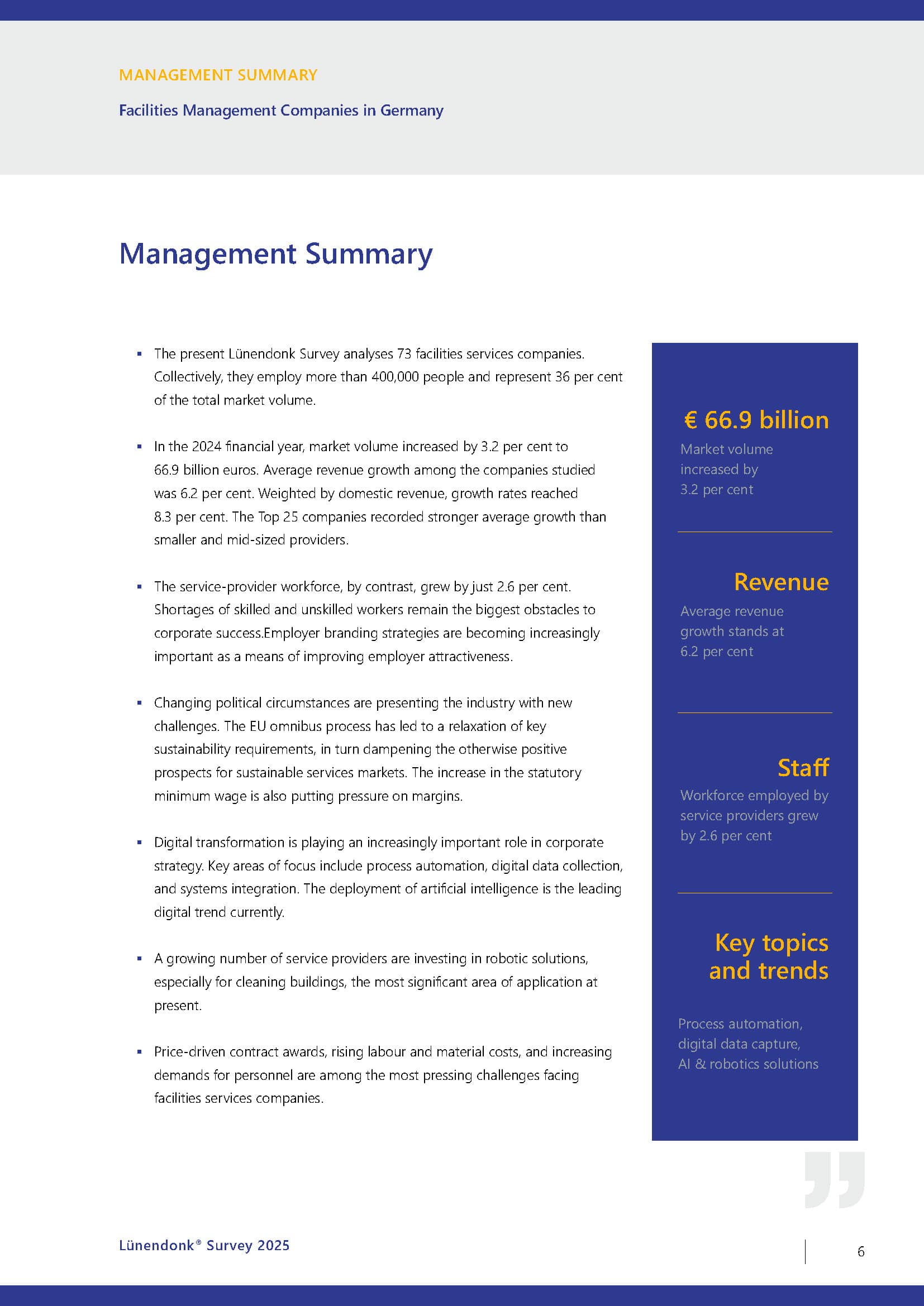 The 22nd edition of this Lünendonk Survey offers relevant key figures, data, developments and insights into the market for facility services in Germany. It is based on comprehensive information from 73 service providers, numerous expert interviews and a classification based on many years of market expertise. The survey is aimed at service providers, clients, market observers, academics, associations and politicians.