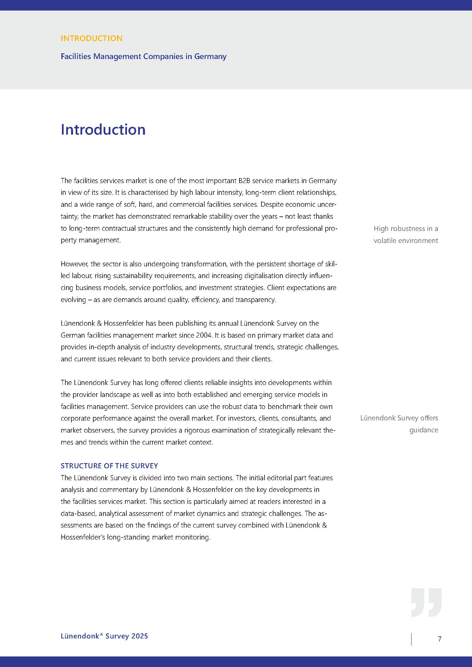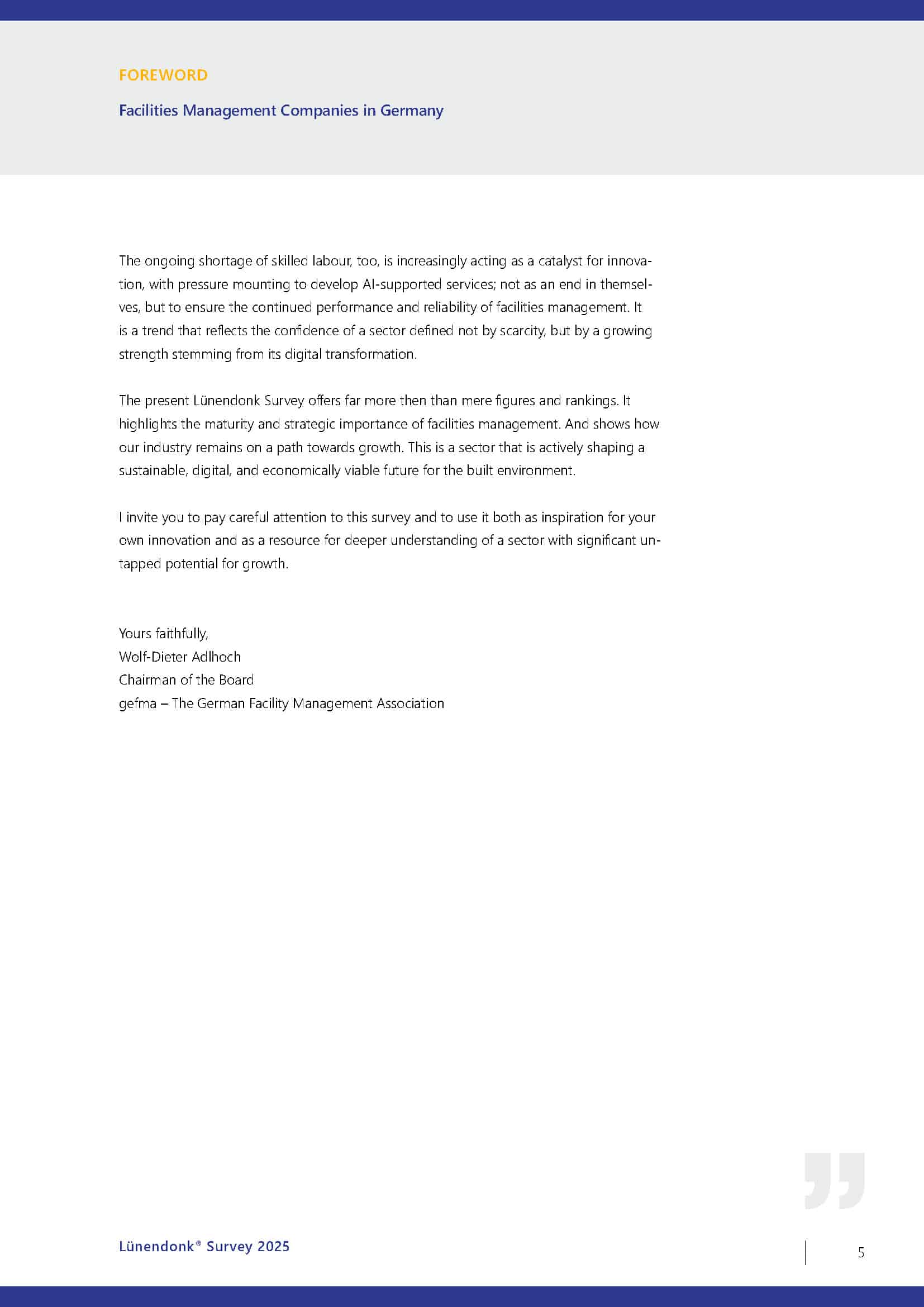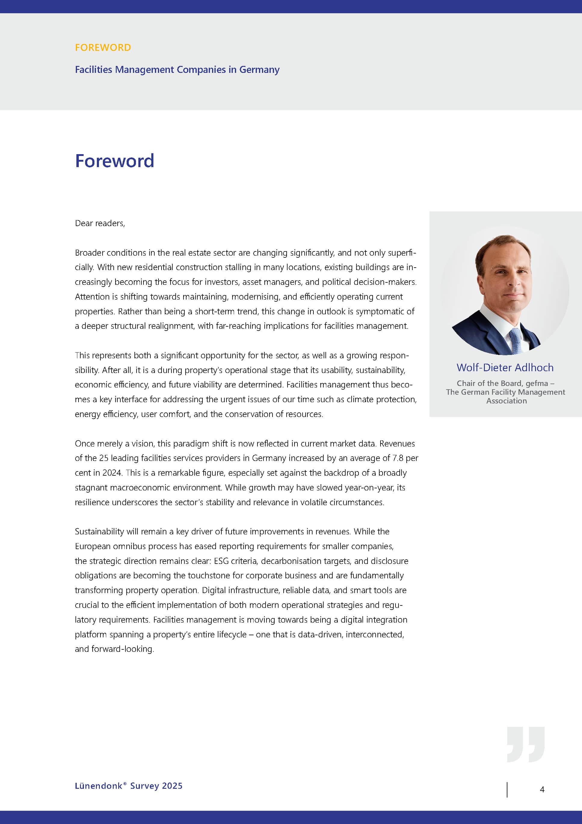 “The Lünendonk Surveys on the FM markets in the DACH region and on many other important key topics in the industry are valuable sources of information and guidance for all relevant stakeholders in the sector. With their analyses and statements on the trends and future of facility management, they have an impact far beyond the industry and help to position the industry’s image professionally and positively in the public eye.”