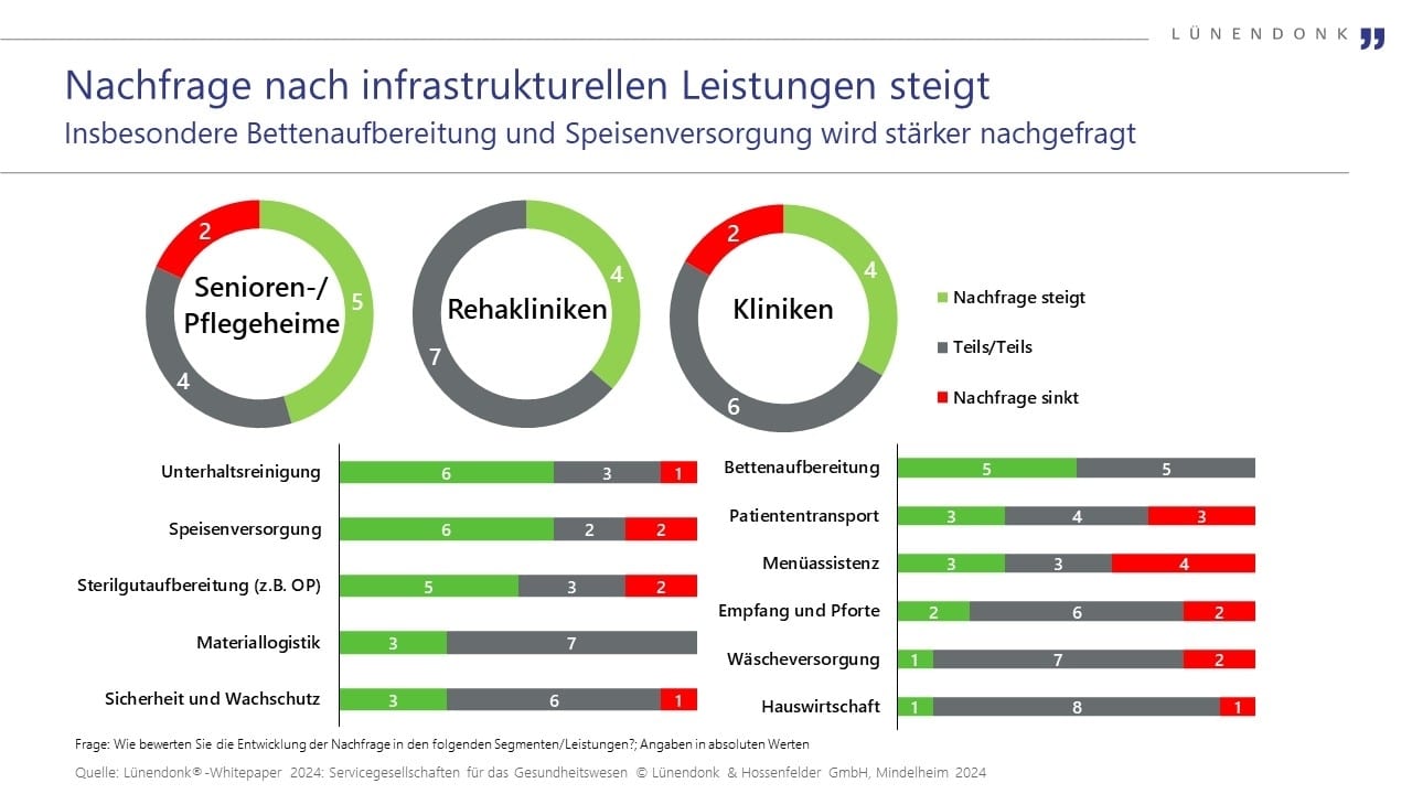 Die Nachfrage nach infrastrukturellen Gebäudedienstleistungen im Gesundheitswesen steigt. Insbesondere der Bedarf an Unterhaltsreinigung und Speisenversorgung nimmt zu, aber auch Sterilgut- und Bettenaufbereitung werden stärker nachgefragt. Dieser Anstieg spiegelt die Diskussionen der letzten Jahre über Hygieneanforderungen, Servicequalität und Kosteneinsparpotenziale wider. Das sind die zentralen Ergebnisse einer exklusiven Befragung führender Gebäudedienstleister für das Gesundheitswesen, die das auf Facility Services spezialisierte Research- und Consulting-Unternehmen Lünendonk & Hossenfelder in einem Whitepaper zusammengestellt hat. Es basiert unter anderem auf den Angaben von 14 Gebäudedienstleistern mit Schwerpunkt im Gesundheitswesen.