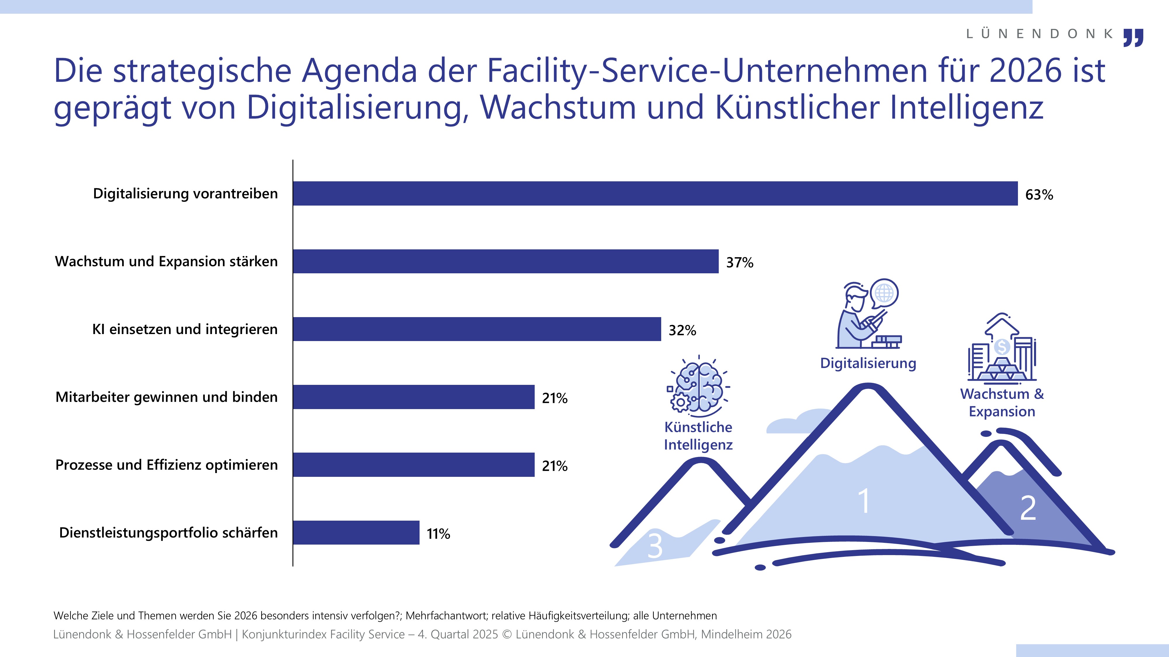 Facility-Service-Anbieter mit positiver Prognose für 2026 Branche erwartet für 2026 ein Umsatzplus von 6,6 Prozent Facility-Service-Anbieter steigerten im vierten Quartal 2025 den Umsatz im Mittel um 7,4 Prozent Internationale Personalgewinnung wird wichtiger Neue Ausgabe des Konjunkturindex Facility Service verfügbar Mindelheim, 5. März 2026 — Facility-Service-Unternehmen in Deutschland setzen ihr Wachstum fort: Im vierten Quartal 2025 steigerten die Anbieter ihren Umsatz um 7,4 Prozent gegenüber dem Vorjahresquartal. Auch auf das Geschäftsjahr 2026 blicken die Dienstleister trotz konjunktureller Herausforderungen optimistisch und erwarten ein Umsatzwachstum von 6,6 Prozent. Für das erste Quartal 2026 prognostizieren die Anbieter bereits ein Plus von 5,5 Prozent. Dies sind Ergebnisse des aktuellen Konjunkturindex Facility Service, den das auf Real Estate Services spezialisierte Research- und Beratungsunternehmen Lünendonk & Hossenfelder vierteljährlich erhebt und unter www.luenendonk.de zur Verfügung stellt. Strukturelle Herausforderungen bremsen das Wachstum Trotz der positiven Marktaussichten bleiben die Rahmenbedingungen für die Dienstleister herausfordernd. Der Personal- und Fachkräftemangel führt seit Beginn der Erhebung des Konjunkturindex Facility Service die Liste der größten Markthemmnisse an – auch aktuell nennen ihn 82 Prozent der Studienteilnehmer. Zudem setzen steigende Kosten und der zunehmende Preisdruck die Anbieter unter Druck: 50 Prozent der Studienteilnehmer zählen ihn aktuell zu ihren drei größten Belastungsfaktoren für die Geschäftsentwicklung. Die Branche reagiert mit einem klaren Bekenntnis zur Technologie: Für 63 Prozent der Facility-Service-Unternehmen ist die Digitalisierung das wichtigste Ziel für 2026. Dabei setzen 32 Prozent der Dienstleister auf Künstliche Intelligenz, um Leistungen und Prozesse effizienter zu organisieren. Rekrutierung von Fachkräften über Landesgrenzen nimmt zu Neben der Digitalisierung rückt für immer mehr Dienstleister auch die internationale Personalgewinnung in den strategischen Fokus. Bereits 28 Prozent der Studienteilnehmer rekrutieren aktiv Beschäftigte aus dem Ausland – mit steigender Tendenz. Besonders große und integrierte Anbieter weiten ihre Recruiting-Aktivitäten über die Landesgrenzen aus. Jörg Hossenfelder, geschäftsführender Gesellschafter von Lünendonk & Hossenfelder, ordnet diese Entwicklung ein: „Die Facility-Service-Branche befindet sich in einer bemerkenswerten Situation: Die Nachfrage nach Gebäudedienstleistungen ist ungebrochen hoch, doch die Fähigkeit, dieses Potenzial auszuschöpfen, wird zunehmend durch den Personalmangel limitiert. Der strategische Dreiklang aus Digitalisierung, Künstlicher Intelligenz und internationaler Rekrutierung verdeutlicht, dass die Branche den Handlungsdruck erkannt hat – und aktiv gegensteuert, um ihre Wachstumsfähigkeit langfristig zu sichern.“ Methodik und Bezug Die vierte Quartalsanalyse des Konjunkturindex Facility Service für das Geschäftsjahr 2025 basiert auf den Angaben von 22 Facility-Service-Unternehmen und ist Teil der seit Anfang 2023 erscheinenden Studienreihe. Der Konjunkturindex Facility Service entsteht in fachlicher Zusammenarbeit mit Bayern FM, Compass Group und Wackler. Die Ergebnisse der aktuellen sowie vorangegangenen Analysen stehen unter www.luenendonk.de zur Ansicht bereit. Für vertiefende Informationen bietet Lünendonk eine Jahreslizenz für vier Ausgaben mit Segmentauswertungen nach Umsatzgröße und Leistungsschwerpunkt zum Preis von 2.000 Euro (zzgl. MwSt.) an. Downloads Presseinformation (.pdf) Grafik zur Presseinformation (.jpg) Direkt zum Konjunkturindex Kontakt für Medienanfragen Telefon: +49 8261 73140-40 E-Mail: presse@luenendonk.de Bitte aktivieren Sie JavaScript in Ihrem Browser, um dieses Formular fertigzustellen.Bitte aktivieren Sie JavaScript in Ihrem Browser, um dieses Formular fertigzustellen.Anrede *FrauHerrDiversVorname *Nachname *E-Mail-Adresse *Medium/Verlag/Unternehmen Nachricht *DSGVO-Einverständnis *Ich habe die Datenschutzbestimmungen gelesen und erkläre mich mit ihnen einverstanden *Absenden
