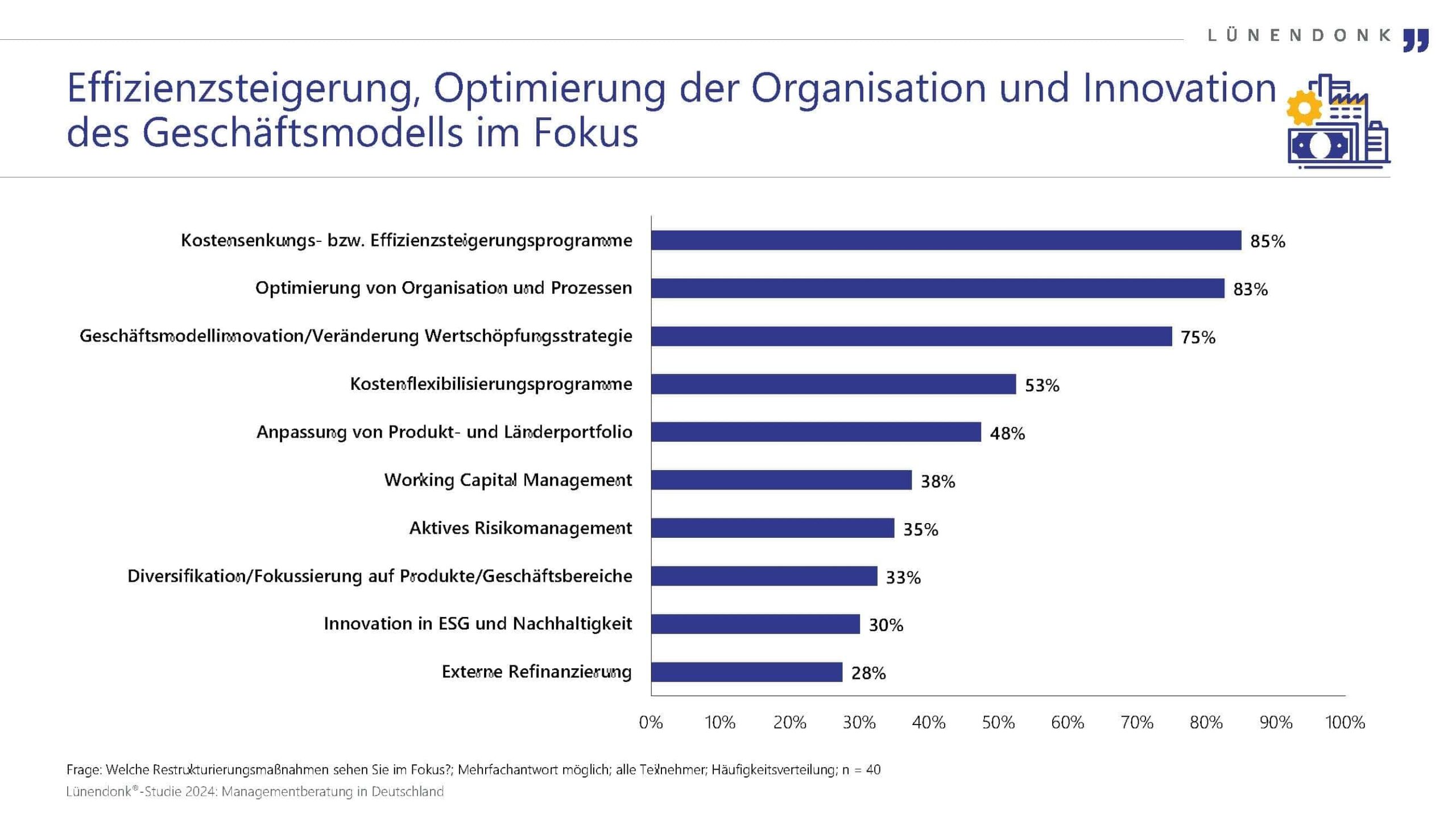 Zu den wichtigsten Restrukturierungs- und Sanierungsmaßnahmen gehören laut 85 Prozent der befragten Consultants Kostensenkungs- und Effizienzsteigerungsprogramme, gefolgt von Organisations- und Prozessoptimierung (83 %). An dritter Stelle rangiert Geschäftsmodellinnovation respektive Veränderung der Wertschöpfungsstrategie (75 %). Mit Abstand folgen Maßnahmen wie Kostenflexibilisierungsprogramme (53 %) sowie Anpassung von Produkt- und Länderportfolio (48 %).