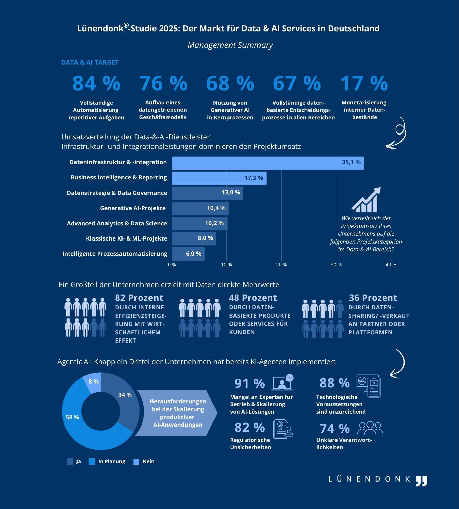 Neue Lünendonk-Studie: Data & AI wird zum zentralen Transformationstreiber – Markt wächst trotz schwacher Konjunktur zweistellig Trotz Konjunkturflaute: D&AI-Dienstleister erzielten 2024 zweistelliges Umsatzwachstum von 13,2 Prozent Enabling Data Layer vor Use Case: Unternehmen investieren vor allem in Dateninfrastruktur und Data Governance Data & Analytics wird zu Data & AI – neue Marktlogik, neue Anforderungen an Dienstleister Neue Lünendonk-Studie ab sofort verfügbar Mindelheim, 3. Dezember 2025 — Der deutsche Markt für Data & AI Services wächst auch 2024 stark: Trotz des schwierigen konjunkturellen Marktumfelds steigern die führenden Dienstleister ihren Umsatz um durchschnittlich 13,2 Prozent – und damit um ein Vielfaches stärker als der Gesamtmarkt für IT-Dienstleistungen (2,6 %). Wesentliche Wachstumstreiber waren die steigende Relevanz von Künstlicher Intelligenz sowie Investitionen in Datenmanagement und Datenqualität: Unternehmen forcierten ihre AI Transformation und investierten in AI-gestützte Lösungen, neue Datenplattformarchitekturen sowie in organisatorische Maßnahmen. Mit Blick in die Zukunft ist der zunehmende Fokus auf autonome KI-Agenten, die ganze Prozessketten automatisieren und eigenständig Entscheidungen treffen können, besonders relevant. Parallel verändert sich der Markt auch strukturell – aus „Data & Analytics“ wird „Data & AI“ (D&AI). Dies sind ausgewählte Ergebnisse der neuen Lünendonk-Studie 2025/2026 „Der Markt für Data & AI Services in Deutschland“, die ab sofort kostenlos unter www.luenendonk.de erhältlich ist. Die Studie entstand in fachlicher Zusammenarbeit mit adesso, b.telligent, Dataciders, Infomotion, Qunis und synvert. Wo der Hype auf Defizite trifft – Dateninfrastruktur wichtiger als Use Case Damit KI-Anwendungen produktiv und skalierbar eingesetzt werden können, benötigen Unternehmen zunächst eine tragfähige technologische und organisatorische Basis. Laut Studie fließt mit 35,1 Prozent der Großteil der Projektumsätze aktuell in Dateninfrastruktur und -integration – deutlich vor Generative-AI-Projekten oder Data Science. Insbesondere moderne Datenplattformen, klare Governance-Strukturen und eine hohe Datenqualität gelten als Voraussetzung für erfolgreiche KI-Nutzung. Aber genau hier besteht noch Nachholbedarf: Nur 62 Prozent der befragten Unternehmen verfügen über ein einheitliches Datenmanagement, und lediglich 77 Prozent haben eine unternehmensweite Datenstrategie etabliert. Ohne robuste Governance und abgestimmte Strukturen bleiben viele KI-Initiativen aber in der Konzeptphase stecken. „Entsprechend finden in diesen Bereichen auch die stärksten Investitionen statt“, beobachtet Mario Zillmann, Partner bei Lünendonk & Hossenfelder und Studienautor. Kunden fordern technologische Tiefe, kulturelle Kompetenz und flexible Delivery-Modelle Die Anforderungen an Data & AI-Dienstleister steigen spürbar: Gefragt sind Partner mit einem breiten Leistungsspektrum, das nicht nur technische Exzellenz in Machine Learning, AI-Automatisierung und Generative AI umfasst, sondern auch organisatorische und kulturelle Fähigkeiten. So erwarten 90 Prozent der befragten Kunden Schulungsangebote zur Förderung einer datengetriebenen Unternehmenskultur, 81 Prozent wünschen sich Unterstützung bei AI-Ethik und Compliance. Darüber hinaus gewinnt Delivery-Flexibilität weiter an Bedeutung: Kunden schätzen dabei nicht nur die Kostenstruktur, sondern vor allem Verfügbarkeit, Geschwindigkeit und Skalierbarkeit. Führende Anbieter von Data & AI Services im Überblick Neben der Studie veröffentlicht Lünendonk auch in diesem Jahr wieder ein Portfolio der untersuchten Dienstleister. Diese werden hinsichtlich ihrer jeweiligen Positionierung, Marktstärke und Portfolioaufstellung verglichen. Als führende Anbieter sieht Lünendonk Accenture, Deloitte, Capgemini, PwC, adesso und Infomotion. Sie kombinieren ein breites Data & AI-Portfolio mit tiefgehender Consulting- und Technologieexpertise, überdurchschnittlich ausgeprägter Marktwahrnehmung und hoher Lieferfähigkeit. Im Verfolgerfeld verortet Lünendonk die D&AI-Spezialisten b.telligent, Dataciders und synvert sowie die thematisch breit aufgestellten Consulting- und IT-Dienstleister IBM, d-fine, valantic, BearingPoint und msg. Aufgrund ihrer etwas geringer ausgeprägten Marktstärke mit Data & AI Services werden CGI, Sopra Steria, Woodmark, Oraylis, Windhoff und HMS unter den Herausforderern geführt. Ebenfalls Teil der Studie ist das Lünendonk-Portfolio der führenden D&AI-Spezialisten mit Hauptsitz in Deutschland, die mehr als 70 Prozent ihres Umsatzes mit D&AI-Dienstleistungen erwirtschaften. In dieser Anbietergruppe zählen b.telligent, Dataciders und Infomotion zu den führenden Unternehmen, während Qunis, synvert und Woodmark dem Verfolgerfeld zugeordnet werden. Ergänzend zu den beiden Portfolios erscheint in diesem Jahr erstmalig eine Marktstichprobe zum DACH-Raum, die Auskunft über die in Österreich und der Schweiz vertretenen D&AI-Spezialisten gibt. Zur aktuellen Lünendonk-Studie Kernbestandteil der Lünendonk-Studie „Der Markt für Data & AI Services in Deutschland“ sind die beiden Lünendonk-Portfolios der führenden 20 D&AI-Dienstleister beziehungsweise führenden 10 D&AI-Spezialisten in Deutschland. Hierzu wurden 24 führende Anbieter von Data & AI Services in Deutschland identifiziert und befragt. Darüber hinaus wurden 170 Daten- und IT-Verantwortliche aus dem gehobenen Mittelstand sowie aus Großunternehmen und Konzernen in Deutschland, Österreich und der Schweiz befragt. Die Ergebnisse beider Befragungen sind Grundlage der neuen Lünendonk-Studie, die ab sofort zum kostenfreien Download unter www.luenendonk.de bereitsteht. Downloads Presseinformation (.pdf) Grafik 1 zur Presseinformation (.jpg) Grafik 2 zur Presseinformation (.jpg) Grafik 3 zur Presseinformation (.jpg) Direkt zur Studie Kontakt für Medienanfragen Telefon: +49 8261 731