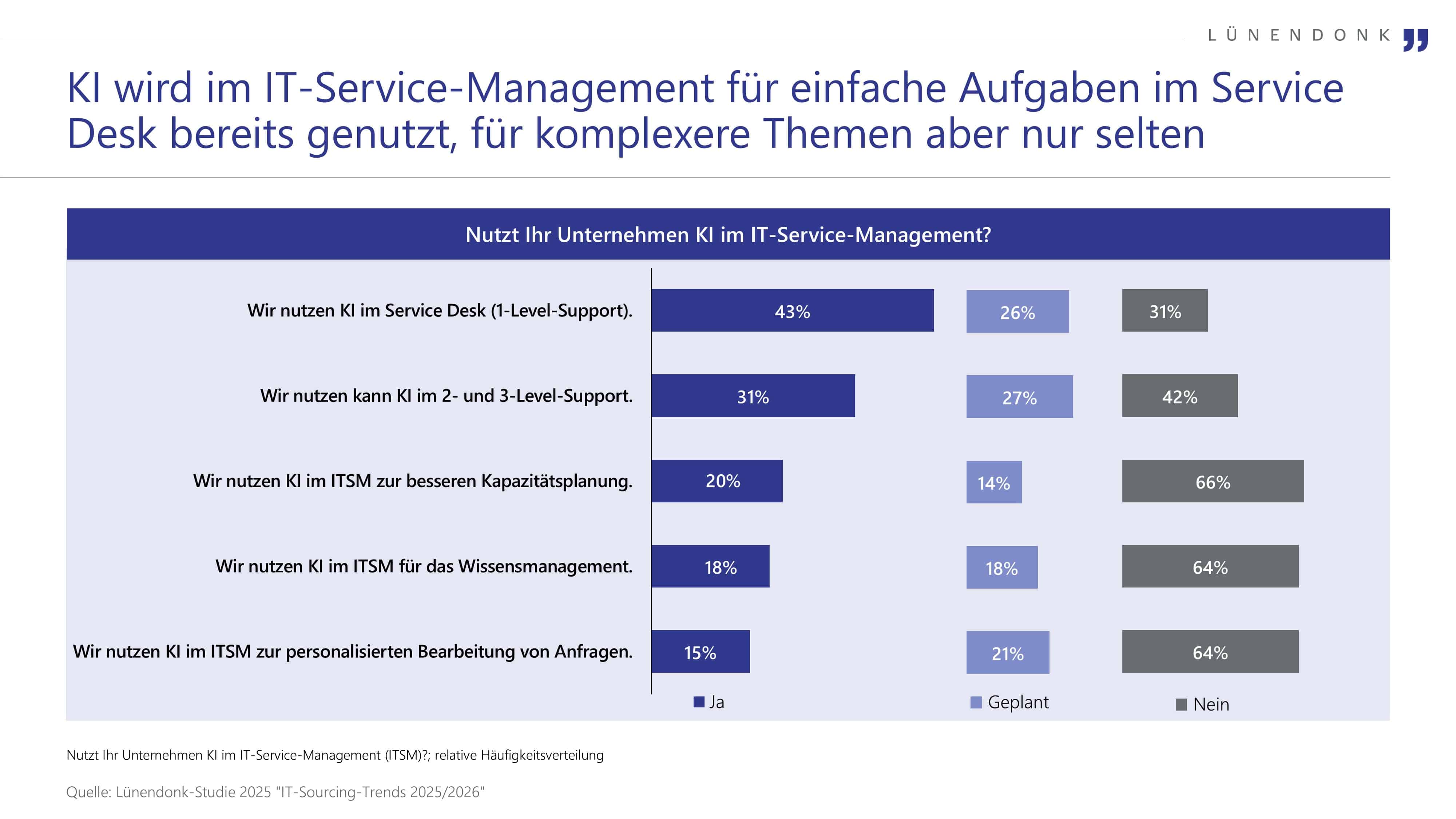 Neue Lünendonk-Studie: Digitale Souveränität und KI verändern das IT-Sourcing CIOs setzen konsequent auf die Cloud, stoßen jedoch beim Cloud Sourcing auf Defizite in der Umsetzung Reduzierung von Abhängigkeiten: Souveräne Cloud-Angebote gewinnen bis 2030 stark an Bedeutung Künstliche Intelligenz wird das IT-Sourcing stark verändern Unternehmen bauen Zusammenarbeit mit IT-Sourcing-Beratungen aus Neue Lünendonk-Studie ab sofort verfügbar Mindelheim, 18. September 2025 — Die Cloud-Transformation, digitale Souveränität und Künstliche Intelligenz (KI) führen zu umfangreichen Veränderungen im IT-Sourcing. Um in diesem Spannungsfeld erfolgreich zu navigieren, überprüfen immer mehr Unternehmen ihre bisherigen IT-Sourcing-Strategien. Während viele Unternehmen beim Cloud Sourcing schon fortgeschritten sind, stehen europäische und insbesondere deutsche Unternehmen angesichts geopolitischer Veränderungen unter Druck, ihre langjährigen technologischen Abhängigkeiten von US-amerikanischen IT-Providern zu reduzieren und systematischer zu steuern. 71 Prozent der Unternehmen wollen daher zukünftig stärker mit IT-Sourcing-Beratern zusammenarbeiten, um unter anderem ihre Interessen gegenüber Cloud-Anbietern besser vertreten zu können. Zudem dringt KI immer tiefer in die IT-Wertschöpfungskette vor, beispielsweise in den Bereichen Cyber Security, IT-Service-Management oder Softwareentwicklung. Mehr als ein Drittel der Unternehmen setzt KI-Lösungen bereits im Service Desk ein. Das sind ausgewählte Ergebnisse der neuen Lünendonk-Studie „IT-Sourcing-Trends 2025/2026“, die ab sofort unter www.luenendonk.de kostenfrei erhältlich ist. Cloud Sourcing erfordert angepasste Strukturen und Prozesse sowie neue Skills Cloud-Technologien sind längst ein integraler Bestandteil der IT- und Geschäftsstrategie. 94 Prozent der befragten Unternehmen haben eine klare Cloud-Strategie. Die Lünendonk-Studie zeigt jedoch, dass es in der Praxis häufig noch an den notwendigen Kompetenzen, Strukturen und Prozessen fehlt, um die Cloud-Nutzung sowohl regelkonform als auch aus wirtschaftlicher Sicht systematisch zu steuern. Vier von zehn der befragten IT-Organisationen schätzen demnach ihre Fähigkeiten im Cloud Sourcing als gering ein. Mit Blick auf die hohen Abhängigkeiten von Cloud-Providern verfügen nur 29 Prozent der Unternehmen über geregelte Exit-Strategien. Das kann zu einem unkalkulierbaren Vendor-Lock-in und kritischen Compliance-Risiken führen. Auch im Cloud-Kostenmanagement, bei der Erfüllung von Compliance-Anforderungen und beim Providermanagement erkennen die von Lünendonk befragten IT-Verantwortlichen einen Nachholbedarf. Zwar haben zwei Drittel der befragten Unternehmen Cloud-Steuerungskennzahlen in ihr IT-Controlling integriert, jedoch zeigen sich große Mängel in der konkreten Umsetzung. Vor allem die mangelnde Steuerungsmöglichkeit der Verbräuche und Kosten, der Aufbau von Transparenz zur Nutzung der Cloud-Services, die Kostenplanbarkeit sowie sinnvolle Berechnungsmetriken stellen 70 Prozent der befragten Unternehmen vor große Herausforderungen. Souveräne Cloud hat hohe Relevanz Um die Abhängigkeit von den marktdominierenden Hyperscalern zu verringern und politische Risiken zu minimieren, suchen deutsche Unternehmen verstärkt nach Alternativen. Wenngleich der Markt für souveräne Cloud-Lösungen noch jung ist und die Angebote nicht in allen Bereichen ausgereift sind, erwarten 62 Prozent der IT-Führungskräfte, dass diese bis 2030 dominieren werden. Als besonders relevant werden lokale Cloud-Provider erachtet, aber auch die souveränen Cloud-Angebote der Hyperscaler sollen an Bedeutung gewinnen. „Die Nachfrage nach souveränen Cloud-Angeboten ist groß – ebenso wie die Unsicherheit, welche Angebote die passenden sind. Souveränität ist nicht per se die Lösung, um Abhängigkeiten zu reduzieren oder Risiken wie einen Kill Switch zu minimieren. Es kommt auf den individuellen Anwendungsfall an und darauf, welche Ziele mit souveränen Angeboten erreicht werden sollen“, kommentiert Tobias Ganowski, Consultant bei Lünendonk und Autor der Studie, die Ergebnisse. KI im Sourcing: IT-Dienstleister stehen unter Druck Zudem beeinflusst generative KI das IT-Sourcing stark und soll zu mehr Effizienzen führen. Einsatzfelder reichen vom Vertragsmanagement über das IT-Service-Management (ITSM) bis zur Softwareentwicklung. Da auch IT-Dienstleister zunehmend auf die Möglichkeiten generativer KI setzen, erwartet die Mehrheit der Unternehmen von ihren IT-Providern, dass diese die dadurch entstehenden Mehrwerte an die Kunden weitergeben – etwa in Form von Preissenkungen oder Qualitätssteigerungen. Für klassische Offshoring-Modelle könnte dies erhebliche Konsequenzen haben, da standardisierte Tätigkeiten künftig stärker automatisiert und durch KI-Agenten übernommen werden. „Vor allem in Bereichen wie Cyber Security, dem Wissensmanagement und im Software-Testing gibt es bereits hohe Effizienzvorteile durch KI“, beschreibt Tobias Ganowski die Marktentwicklung. IT-Sourcing-Beratungen gefragter denn je Aufgrund der Vielzahl an Fragestellungen und Herausforderungen sind IT-Sourcing-Beratungen stark gefragt. 61 Prozent der IT-Verantwortlichen wollen 2026 ihr Budget für externe IT-Sourcing-Beratung erhöhen – davon etwa die Hälfte sogar um über 5 Prozent. Mit anziehender Konjunktur und steigenden Investitionen in die digitale Transformation wollen bis 2028 sogar 78 Prozent ihr Budget jährlich erhöhen. Zur aktuellen Lünendonk-Studie Für die Lünendonk-Studie „IT-Sourcing-Trends 2025/2026“ wurden 121 IT-Verantwortliche mittelständischer und großer Unternehmen aus diversen Branchen zu deren IT- und Sourcing-Strategien befragt. Zudem wird in der Studie die Sicht von 31 IT-Sourcing-Beratungen zu deren Geschäft analysiert. Die Studie, die in zehnter Auflage erscheint, wurde in fachlicher Zusammenarbeit mit Datagroup, Metrics, Mindeight, Mita und PLS erstellt u