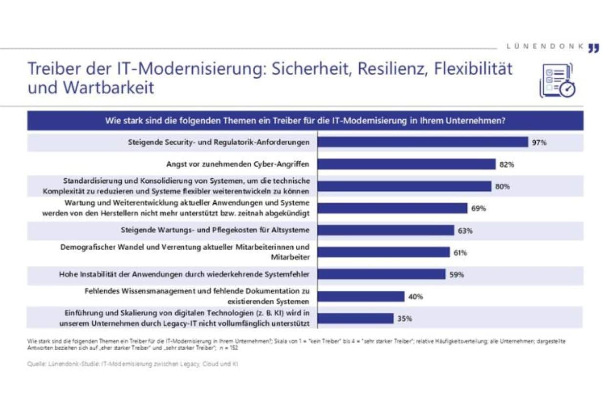 62 Prozent der befragten Unternehmen geben an, dass Teile ihrer geschäftskritischen Anwendungen bereits so veraltet sind, dass sie den heutigen Anforderungen nicht mehr gerecht werden und erneuert werden müssen. Zudem sind Betrieb, Pflege und Weiterentwicklung der Altsysteme in jedem zweiten befragten Unternehmen mittel- bis langfristig nicht mehr sichergestellt. 76 Prozent der Unternehmen erwarten daher, dass mindestens 20 Prozent aller geschäftskritischen Kernapplikationen in den nächsten fünf Jahren einen Modernisierungsbedarf haben werden. „IT-Modernisierung ist kein kurzfristiges Projekt, sondern eine dauerhafte Transformationsaufgabe. Unternehmen benötigen klare Zielbilder, abgestimmte Strategien und ein Zusammenspiel aus Technologie, Organisation und Kultur. Nur so lassen sich IT-Architekturen schaffen, die den Anforderungen von morgen gerecht werden“, kommentiert Tobias Ganowski, Consultant bei Lünendonk und Studienautor.