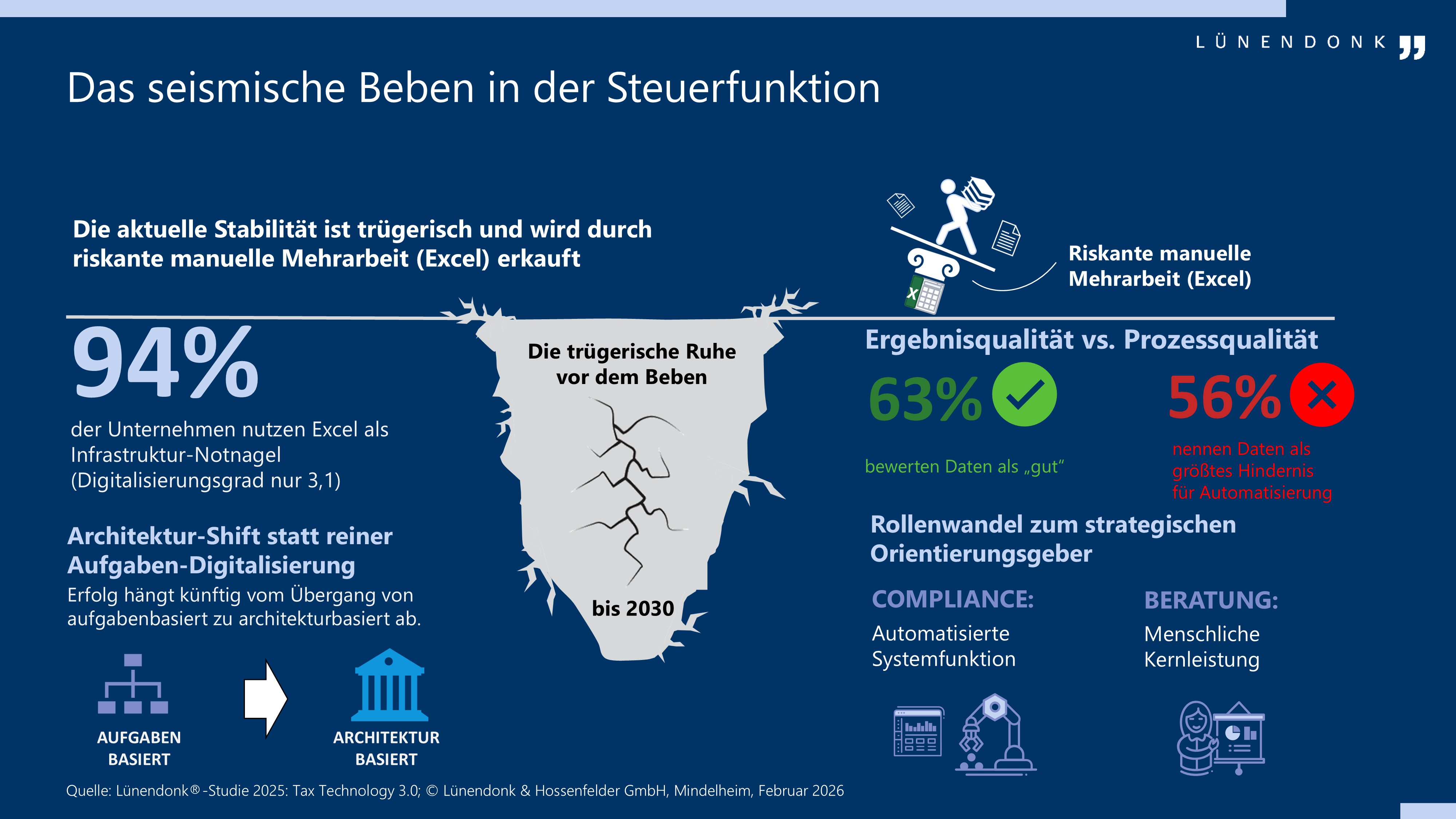 Neue Tax-Technology-Studie: Wie weit sind die Finanzfunktionen auf die KI vorbereitet? Tax Technology für Steuerfunktionen strategisch notwendig KI bietet Chancen, wird aktuell indes wenig genutzt Systembrüche und Datenlücken wirken als Hemmschuhe Lünendonk-Studie ab sofort verfügbar Mindelheim, 24. Februar 2026 — Tax Technology hat sich in der deutschen Steuerlandschaft vom Zukunftsthema zur strategischen Notwendigkeit entwickelt. Steigende regulatorische Anforderungen, internationale Berichtspflichten, E-Invoicing und der zunehmende Fachkräftemangel erhöhen den Druck auf Steuerfunktionen. Es gilt, die Arbeitsweisen sowie die Rollenverteilung innerhalb der Finanzabteilung grundlegend zu verändern. Gleichzeitig wecken Automatisierung und Künstliche Intelligenz hohe Erwartungen an Effizienz, Transparenz und Entscheidungsunterstützung. Doch wie weit ist die Praxis tatsächlich? Wo bestehen strukturelle Lücken? Welche Maßnahmen sind notwendig, um Tax Technology als strategischen Umbau der Steuerfunktion zu gestalten? Mit der neuen Studie „Tax Technology 3.0“ legt Lünendonk & Hossenfelder erstmals eine empirische Bestandsaufnahme des deutschen Marktes vor. Die Ergebnisse zeichnen ein differenziertes Bild: Auf der Oberfläche erscheinen viele Steuerfunktionen leistungsfähig und verlässlich – doch darunter verbirgt sich eine fragmentierte Systemlandschaft, die auf manueller Kompensation statt auf belastbaren Strukturen beruht. Digitale Lösungen zwischen Stabilität und Fragmentierung Punktuelle Digitalisierung ist weit verbreitet, doch eine konsistente Gesamtarchitektur bleibt die Ausnahme. „Excel fungiert zugleich als Brücke, Klammer und Notnagel. Es zeigt die architektonische Schwäche der Steuerfunktion“, sagt Götz Kümmerle, Partner bei Lünendonk und Co-Autor der Marktstudie. Fortschritte in der Digitalisierung entstehen oft nur punktuell, ohne einen strukturellen Wandel herbeizuführen. KI und E-Invoicing als Treiber des Wandels Elektronische Rechnungen verlagern Prüfprozesse zunehmend in Echtzeit und setzen etablierte Kontrollmechanismen unter Druck. Die Studie verdeutlicht: Nicht einzelne Tools, sondern die End-to-End-Architektur der Steuerfunktion entscheidet über den strategischen Erfolg. Künstliche Intelligenz wird derzeit meist punktuell eingesetzt, häufig in Pilotprojekten oder für Aufgaben wie Dokumentengenerierung. Der entscheidende Hebel liegt nicht in der Technologie selbst, sondern in der Neugestaltung von Daten-, Prozess- und Verantwortungsstrukturen. Die neue Lünendonk-Studie „Tax Technology 3.0“ wurde in Kooperation mit DCCS, Ecovis, Grant Thornton, KMLZ und WTS durchgeführt und steht ab sofort unter www.luenendonk.de zur Verfügung. Sie richtet sich an Entscheidungsträger in Wirtschaftsprüfungs- und Steuerberatungs-Gesellschaften, an Mandanten sowie an technologieorientierte Beratungsunternehmen, die den Einsatz von KI verantwortungsvoll gestalten und die Transformation der Branche aktiv begleiten möchten. Downloads Presseinformation (.pdf) Grafik zur Presseinformation (.jpg) Direkt zur Studie Kontakt für Medienanfragen Telefon: +49 8261 73140-40 E-Mail: presse@luenendonk.de Bitte aktivieren Sie JavaScript in Ihrem Browser, um dieses Formular fertigzustellen.Bitte aktivieren Sie JavaScript in Ihrem Browser, um dieses Formular fertigzustellen.Anrede *FrauHerrDiversVorname *Nachname *E-Mail-Adresse *Medium/Verlag/Unternehmen Nachricht *DSGVO-Einverständnis *Ich habe die Datenschutzbestimmungen gelesen und erkläre mich mit ihnen einverstanden *Absenden