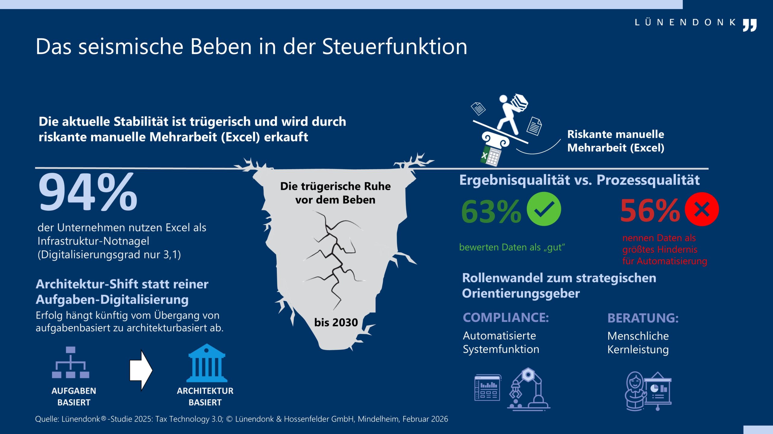 Mit der neuen Studie „Tax Technology 3.0“ legt Lünendonk & Hossenfelder erstmals eine empirische Bestandsaufnahme des deutschen Marktes vor. Die Ergebnisse zeichnen ein differenziertes Bild: Auf der Oberfläche erscheinen viele Steuerfunktionen leistungsfähig und verlässlich – doch darunter verbirgt sich eine fragmentierte Systemlandschaft, die auf manueller Kompensation statt auf belastbaren Strukturen beruht.