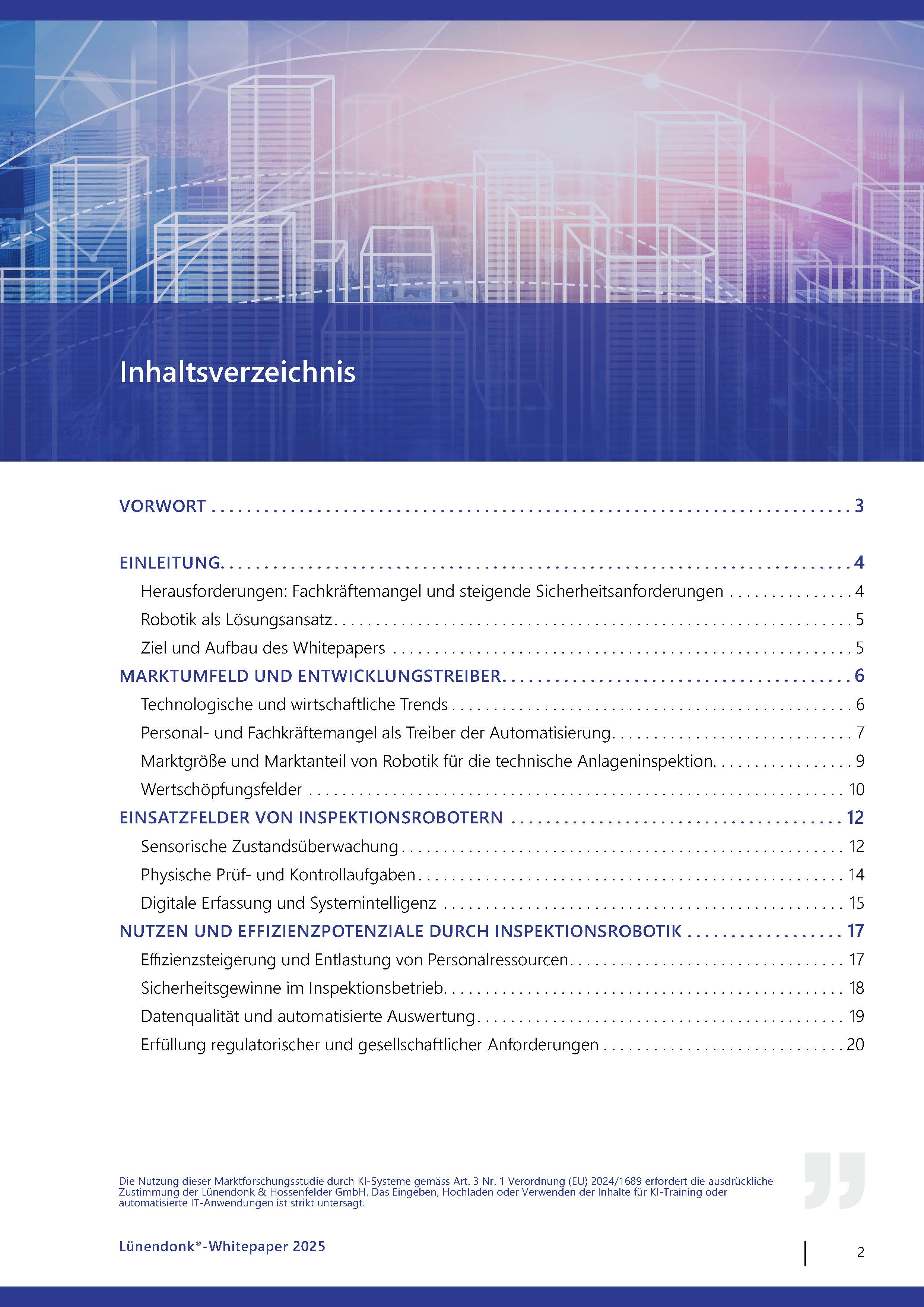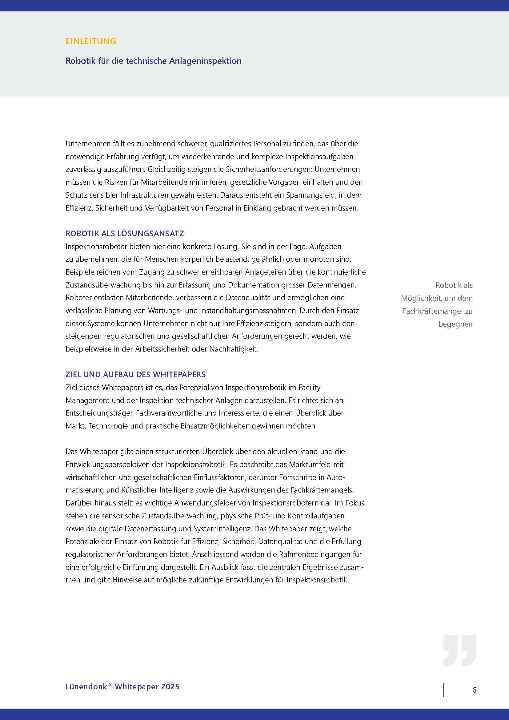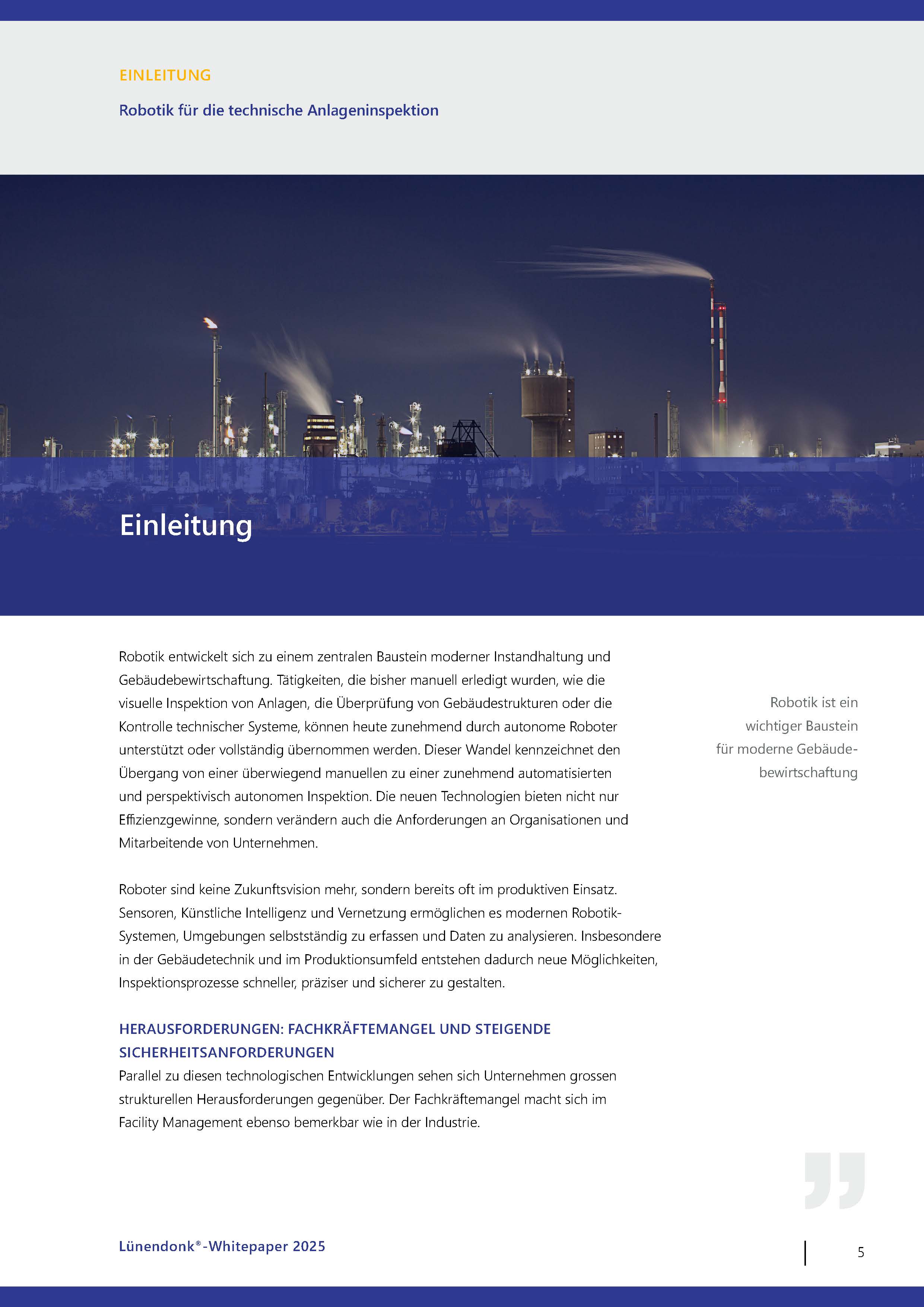 Mehr Sicherheit und Effizienz im Facility Management: Roboter übernehmen technische InspektionenEinsatz von Inspektionsrobotern erhöht Datenqualität, Arbeitssicherheit und Effizienz in Industrieanlagen | Robotik bietet Lösungsansätze gegen Fachkräftemangel, Kostendruck und steigende Sicherheitsanforderungen | Neues Lünendonk-Whitepaper „Robotik für die technische Anlageninspektion“ ab sofort kostenfrei verfügbar Weiterlesen Mehr Sicherheit und Effizienz im Facility Management: Roboter übernehmen technische Inspektionen