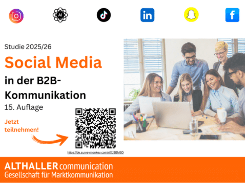 Vor diesem Hintergrund möchten wir auf die Langzeitstudie des Arbeitskreises aufmerksam machen – die aktuelle, branchenübergreifende Erhebung läuft derzeit auf Hochtouren. Die Umfrage, die auf Initiative von Althaller communication Gesellschaft für Marktkommunikation durchgeführt wird, bezieht den ganzen DACH-Raum ein und befragt seit 2010 B2B-Kommunikationsverantwortliche nach ihrer Social-Media-Nutzung und ihren Plänen für die kommenden Jahre.